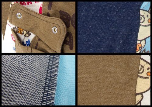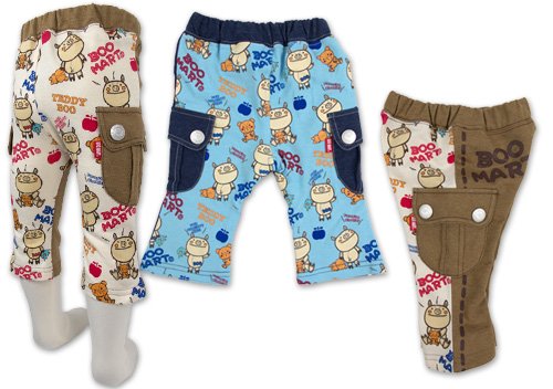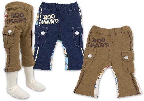 超人気ブーマートのアップリケ風プリントミニ裏毛×デニムニット切り替えカーゴパンツです 見た目はデニムのようだけど、ニットならではの風合いストレッチ性を兼ねたデニムニットと裏糸をパイル状(ループ状)に編み込んで浮かせたもので、ループの小さなミニ裏毛の切り替え素材使用。 裏糸のパイルは短いのでさらっとした履き心地です。 左右に大きな飾りボタン付きポケット。前身ごろはデニムニット、後ろ身ごろはミニ裏毛のアップリケ風BOO総柄プリント☆ お色はネイビーとモカブラウンの2色展開です サイズ: 80cm/90cm/95cm カラー: ネイビー/モカブラウン 素材: 無地部分・綿80% ポリエステル20% 総柄部分・綿100% 原産国: 中国