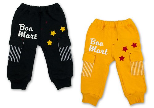 大人気ブーマートのカーゴパンツです。 お肌に触れる面はふわふわの起毛でベビーちゃんもあったか☆ 表はシンプルにロゴプリントと三つのお星さまのアップリケ 後は右側に大きく入ったBOOのにっこりフェイスがとってもCUTE☆ 両サイドにはストライプ柄のポッケ付☆ お色はブラックとカラシの2色展開です サイズ: 80/90/95 カラー: ブラック/カラシ 素材: 本体・綿100% リブ部分・綿95% ポリウレタン5% 原産国: 中国