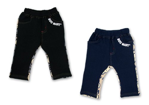 大人気ブーマートのBOOフェイスプリントがCUTEなパンツです。 毛足が比較的寝ているので裏毛特有の凹凸は控え目で、トレーナーによく使用されるガーゼ裏毛使用 前はシンプルにBOOのロゴだけで かっこよく 後はおしりから足まで入ったBOOのフェイスプリントがとってもCUTE☆ ウェストハゴムでラクラク お色はブラックとネイビーの2色展開です サイズ: 80/90/95 カラー: ブラック/ネイビー 素材: 本体・綿100% リブ部分・綿95% ポリウレタン5% 原産国: 中国