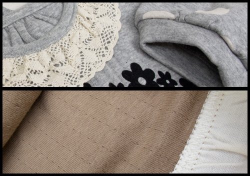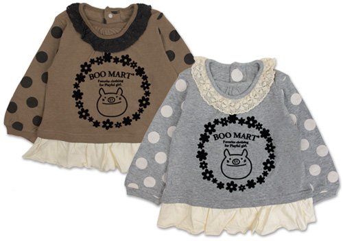 大人気ブーマートの落ち着いたトーンの生地と水玉柄がピッタリマッチ☆裾シフォンチュニックです 後ろに3つのホックがついているので着脱もラクラク☆ 2枚の生地を重ねて縫い合わせているので肌触り良く柔らか☆(表面がカットソー素材・裏面がガーゼ風 ) ちょっぴりもこもこしたお花プリントの真ん中でBOOがニッコリかわいいっ*^O^* 首回りはレース、裾部分はふんわりシフォンで女の子らしさもバッチリアピール 色はブラウンとグレーの2色展開 サイズ: 80/90/95 カラー: ブラウン/グレー 素材: 本体・綿100% リブ部分・綿95% ポリウレタン5% 原産国: 中国