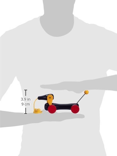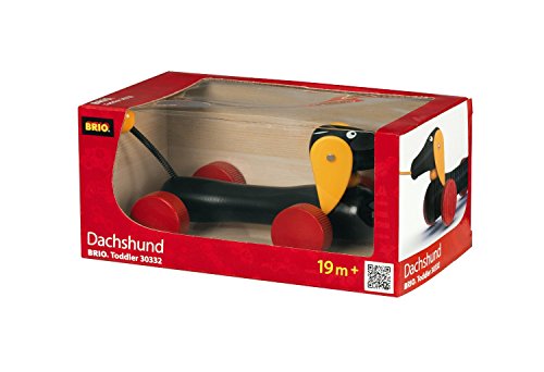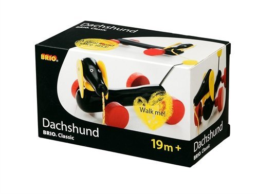 Founded in Sweden in 1884, Brio makes the highest quality wooden toys that have delighted children and created happy memories for generations. Both educational and fun, Brio's uncompromising focus on design, quality and craftsmanship create toys of lasting value that stimulate creativity and imagination. Engaging play and learning are integral themes in all Brio toys, satisfying a child's educational needs and growing with them through their various phases of development. Wooden pull toys are perfect for the active and newly mobile youngster. The Dachshund pull-along from Brio has been a beloved, classic toy since 1953 and a perfect playmate for today's toddler. The bright, vibrant colors appeal to young children. This dashing dog always keeps up. As it is pulled along the head turns, the ears move and the tail wags. The bright red wheels work on any floor surface. Handcrafted to the exacting quality standards you'd expect from Brio, this durable, wooden playroom heirloom will be enjoyed for generations. Made of solid Beech wood and sanded silky smooth, they have 6 coats of non-toxic paint for a long lasting, chip resistant, vibrant glossy finish. The perfect size for the active, imaginative toddler, they'll learn to control movement, develop motor skills and develop balance with every step.