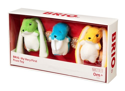 Brio My Very First is a range of high quality baby toys made from soft, plush fabric containing an element of Brio's traditional wood.These 3 detachable friends are as happy to just hang around the pram as they are to hop down for a little cuddle. The long ears and soft teeth are easy to grip and they all have a different sound to be discovered.