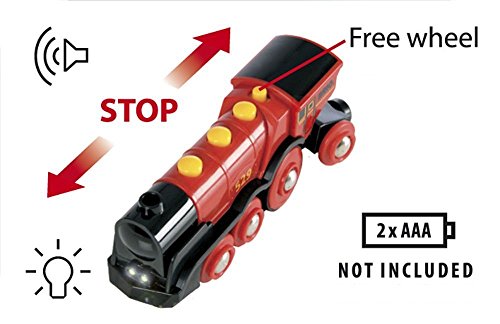 Keep aspiring train drivers occupied! The large battery operated locomotive has two front lights and manual buttons for 'full steam ahead', reverse and the characteristic 'choo-choo' sounds. Button on top of engine also allows free wheel play without batt