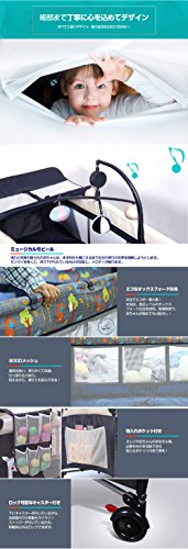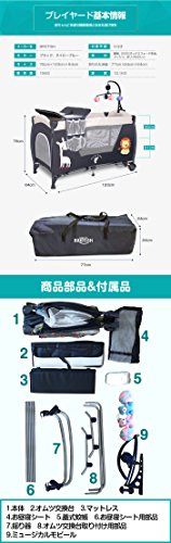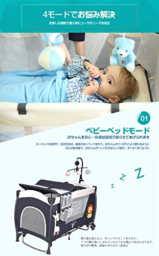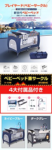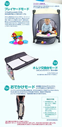 - プレイヤードサイズ:約123×64×76cm、折り畳み:約77×24×24cm、0-3才用 4大付属品(蓋式蚊帳、オムツ交換台、ミュージカルモビール、揺り器)付き、マットレス付き