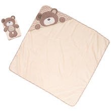 The wash mitt is just right for gently scrubbing your little angel, while the towel is designed with a hood to keep him comfy and bundled up after he's all squeaky clean;Both are made of super-absorbent cotton fabric and decorated with cute fabric bears;Both are designed in ecru and decorated with light brown fabric bears and matching striped trim