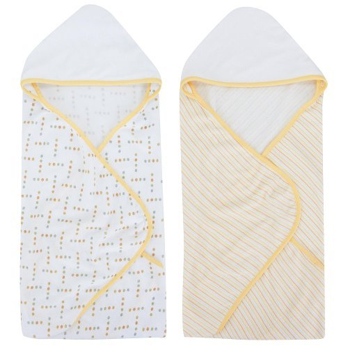 Set includes 2 hooded towels;Keeps your little one dry and cozy;Designed primarily in white and yellow; each features terrycloth fabric on one side;First towel features a striped pattern; the other is decorated with dots;Made of 70% cotton, 30% polyester material (exclusive of decoration)