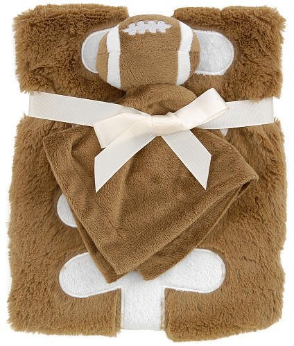 Includes 1 large blanket and 1 security blanket;This football blanket is the perfect size for swaddling, and the security blanket will comfort your little one;Made from super-soft 100% polyester;Large blanket is brown with ivory laces; security blanket has an attached football-shaped plush;Large Blanket: 26 x 34 inches; Small Blanket: 12 x 12 inches/ Machine wash warm, tumble dry low