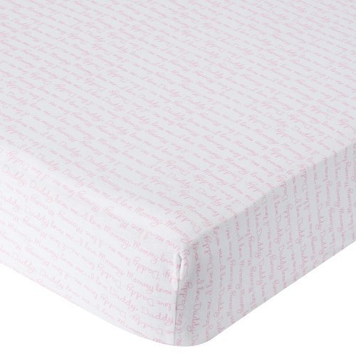 Fits standard crib mattresses measuring 28 x 52 inches;White sheet is decorated with a pink script print;Made of soft 100% cotton;Includes 1 fitted sheet;Machine wash warm, tumble dry