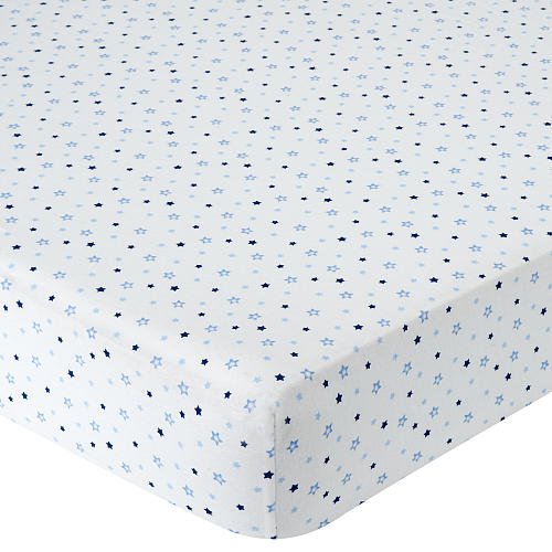 Fits standard crib mattresses measuring 28 x 52 inches;White sheet decorated with tiny blue stars;Made of soft 100% cotton;Includes 1 fitted sheet;Machine wash warm, tumble dry