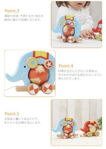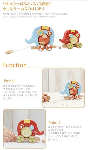 - 1、ひもをひっぱると、タイヤと連動して中央の球体・円形パーツがぐるぐる回転し、上部の小さなタイヤも連動して回転する仕掛けです。ぞうがサーカスしているように見えます。