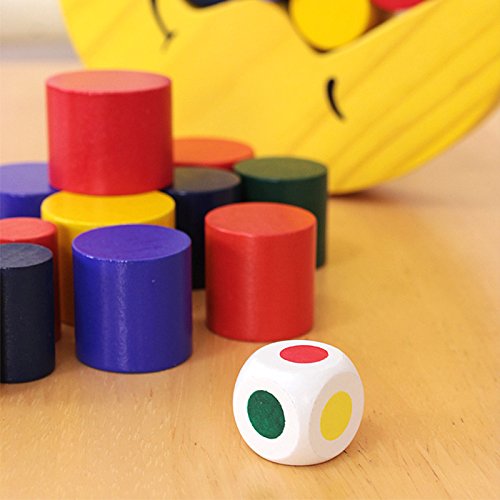 数人で遊ぶ際には、順番にサイコロを振って対応している色の丸い積み木をお月様に載せていきます。使い切った色の目が出たら、もう一度サイコロを振るか積まないか選べる、など話し合ってオリジナルのルールを設けして楽しめます。