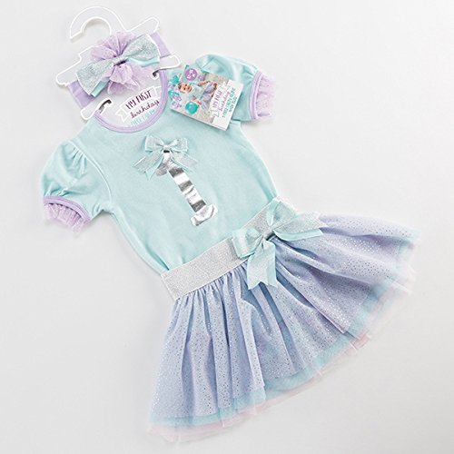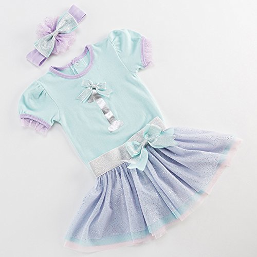 - ☆清潔感溢れるアクアベースにシルバーの1がプリントされたボディスーツ、ラベンダーとアクアのチュチュにラメが散りばめられたスカート、大きなお花のデコレーションが付いたヘッドバンドがセットになりました♪♪