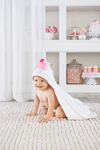Lush, terry towel with pale pink trim features sugary sweet cupcake applique with white and powder blue striped cupcake liner, decorated with bubble gum pink icing chiffon ruffles and hot pink satin rosette cherry;Machine-washable;Size 0-9 months