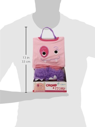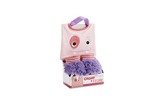 Features- Monsterously adorable, light - pink bib with appliqued face and raspberry trim at the neck, along with color - coordinated, striped, furry booties with felt toenails