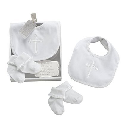Many parents choose to have their new little ones baptized. This Beautiful Blessings bib and sock baby gift set is perfect for that special day. Made of bright white materials as soft and delicate as they are, help baby look their best in this tenderly edged and embroidered bib and socks.