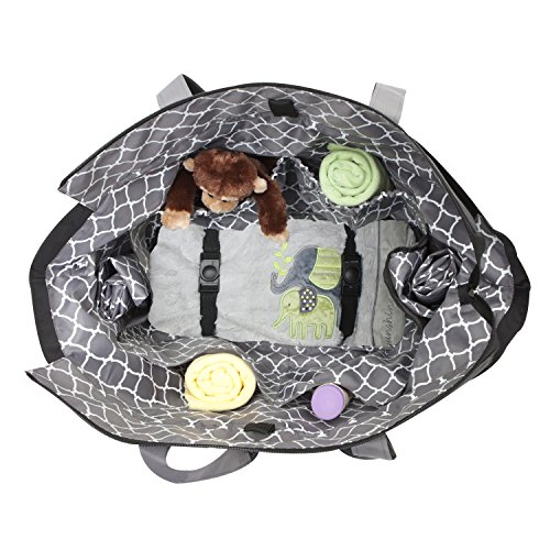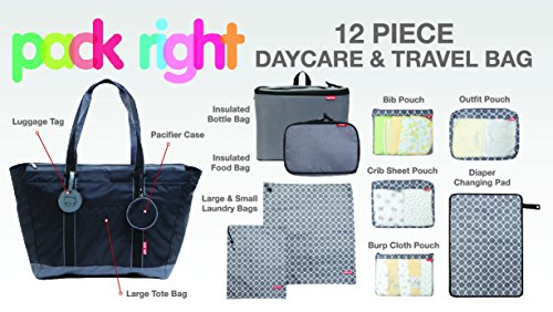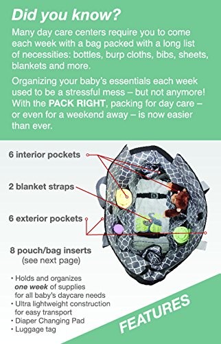 Holds and organizes one week of supplies for all baby's daycare needs, ultra lightweight construction for easy transport;Separate, removable and labeled pouches for: bibs, crib sheets, burp cloths, outfits;12 pieces ?2 insulated bags-one for bottles and one for food, 2 laundry bags-small and large, changing pad, pacifier case;Bag bottom includes straps to secure blankets;Holds and organizes one week of supplies for all baby's daycare needs. Also great for trips and getaways