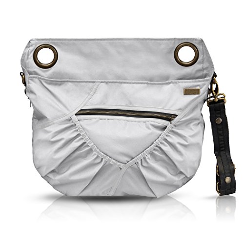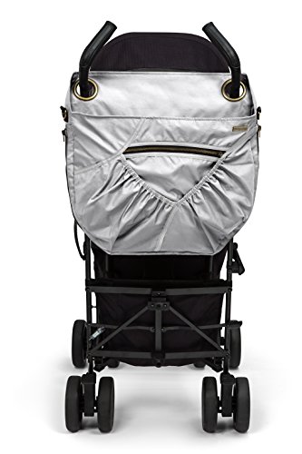 Beautiful lightweight fabric, brass details and stylishly zippered seams;Universal handle hooks, brass grommet rings for umbrella strollers and an attachment snaps for strollers with one handle;Detachable and adjustable shoulder strip;2 side bottle pockets
