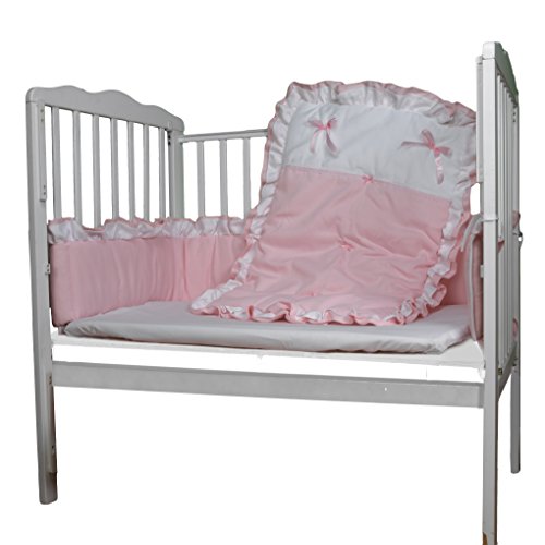 SET INCLUDES: comforter 26X35, white sheet for a standard mini crib 24x38x4 and 1 piece bumper 124x8.;POLY/COTTON SHEET ?HAS ELASTIC ON THE EDGES to ensure a perfect SnugFit. Bumper and sheet is designed to fit all standard portable/mini crib mattresses. Will fit most pack????lay mattresses as well. Bumper keeps baby?? head from knocking against the crib slats. Filled with 100% polyester fiber fill. Comforter is filled with 100% polyester fiber fill which gives a soft yet sturdy feel. Can be used as blanket or decoration.;THE INTRICATE YET SIMPLE baby bedding set will quickly become a family favorite. The navy and white on the bumper and comforter are divided with a delicate lace. The bows and ruffles add a neat and lovely finishing touch. The rich pink color will make it into the most girly baby nursery.;MANUFACTURED FULLY IN THE USA. Easy care instructions: Wash separately on delicate cycle,cold water. Hang to dry. Sheet can be placed in the dryer. Iron on low if needed.;COORDINATES WITH BABYDOLL BEDDING REGAL COLLECTION. Mini crib skirt can be purchased separately for a complete look. Collection includes: Crib bedding set, toddler bedding set, diaper stacker, valance