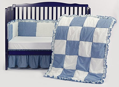 ベビードール寝具Gingaham /ハトメパッチワークベビーベッド寝具セット、ブルー、4ピース