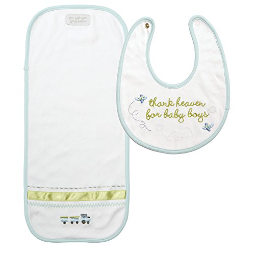 Coordinating burp cloth and bib set with ribbon and embroidery details;Bib measures 85 x 105-inches; burp cloth measures 85 x 20-inches;Made of 100% cotton interlock; machine wash;Sentiment reads: Thank heaven for baby boys;Look to Baby Dumpling by CR Gibson for the sweetest gifts to thrill every new mom
