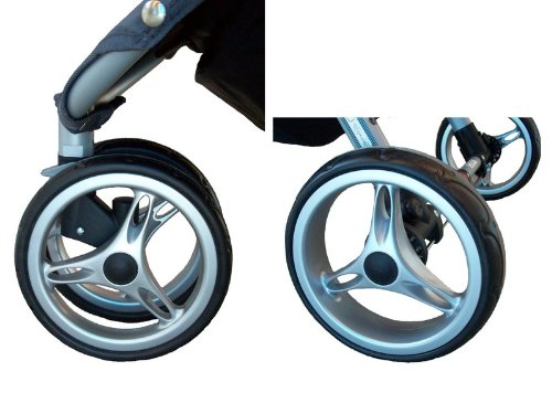 全輪8インチ(20cm)、グリスが洩れにくく外部からの異物やダストが内部に容易に侵入できないシールド ボールベアリング内蔵のEVAタイヤ。空気タイヤではないので、空気入れは不要。全輪ワンタッチで取り外しが可能。前輪サスペンションが衝撃を吸収し、お子様に快適な乗り心地。前輪は、360度回転から直進に簡単切り替え可能