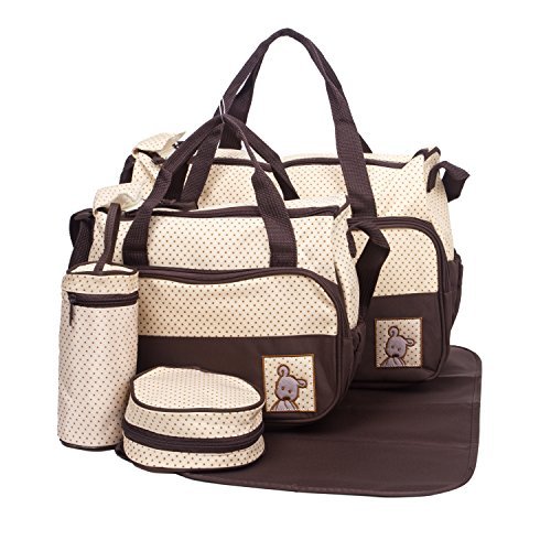 Extra roomy main compartment with multiple pockets ,Reliable zip-top closure with carrying strap, Mid-Size Tote bag with zipper closure and shoulder strap for busy mom.;5 pieces combination Set of mommy bags: 1 Large capacity mommy bag, 1 Medium mommy bag,1 Lunch bag, 1 Baby bottle bag, 1 Diaper mat.;Material :High Quality thick microfiber fabric, High-density polyester with waterproof lining,easy to wipe clean.;3 carry ways: Shoulder bag, Messenger bag, Handbags.;Multi-pockets Diaper Bag Insert Organizer Ideal for keeping diapers,toys,milk cans ,bottles,snack ect