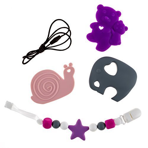 Safe for babies: Made of eco-friendly food-grade silicone is free of BPAs, Phthalates, cadmium, lead, latex or any harmful toxins.;Soothing relief for your baby; The silicone has a soft yet firm texture that helps reduce drooling and provides teething relief; It can also be frozen or cooled to help your baby's itchy sore gums.;Includes a chewable pacifier clip measuring 8.5 inches long with silicone beads securely placed between the clip (pvc) and and loop; attach your favorite pacifier or a Chew-choos teether for your baby to play with under direct adult supervision.;This FDA-approved silicone is also dishwasher safe, hygienic, hypoallergenic and resistant to bacteria.;This teether gift set work best for babies strong enough to hold a bigger heavier objects at around 6 months and up; however, it does include a necklace cord to allow parents to wear the teether while holding their babies