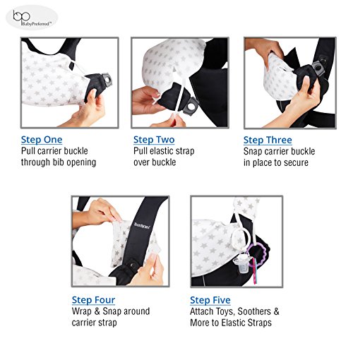 オーガニックバンブー(竹)70%、コットン30%素材は、 抗菌性を高め、ソフトな肌触りで、化学物質が一切含まれないため肌の弱い赤ちゃんでも安心。 BabybjörnベビービョルンオリジナルとErgobaby ADAPTエルゴべビー(アダプト)に対応。 ベビープリファード3点セットは、抱っこひもに簡単に取り付けられるシンプルなデザイン。 最初にベビーキャリアのストラップによだれカバーを取り付けます。次に前面部分に胸カバーを装着。赤ちゃんの顔に傷がつかないようにカバーしてくれます。ループ付きですので、赤ちゃんの大好きなおもちゃも取り付けることができます。 汚れてもカバーだけを取り外し、簡単お洗濯。衛生的で、安心して赤ちゃんがなめられます。