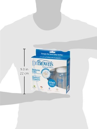 Style:8 Ounce |? Size:3-Pack Product Description The Dr. Brown's Natural Flow Wide-Neck Baby Bottles offer a wonderful feeding experience with innovative vent technology. Dr Brown's bottles use a patented 2-piece internal vent system for your baby's comfort. This system creates positive-pressure flow for vacuum-free feeding that is similar to breastfeeding. The breast milk or formula flows freely without nipple collapse. As the baby feeds, air is channeled from the nipple collar through the vent system to the back of the bottle. Air never mixes with the breast milk or formula so oxidation is prevented, thereby maintaining essential vitamins such as C, A and E. The vent system eliminates air bubbles in the formula or milk, which helps to reduce feeding problems like colic, spit-up, burping and gas. Dr. Brown's bottles are completely BPA, PVC, lead and phthalate free for your baby's safety. Each bottle comes with 1 Level-One silicone nipple, 1 two-piece patented internal vent system, 1 cleaning brush and instructions. From the Manufacturer This is created by a physician. Dr. Brown's Natural Flow baby bottles feature a patented internal vent system that helps reduce colic, spit up, burping and gas. Its positive pressure design allows babies to feed comfortably, because the vent system eliminates the air bubbles and vacuum. All the parts are dishwasher safe. Dr. Brown's 3-pack of wide neck 8 oz Polypropolene baby bottles comes with Level 1 silicone nipples and cleaning brush.