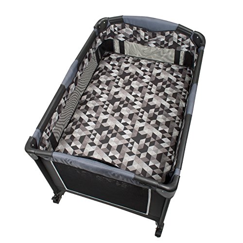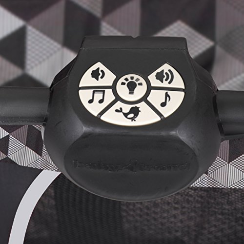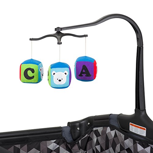 Enhances eye-hand coordination with 3 adorable toys to reach, bat and grasp;Large wheels with brakes;Flip over changer station;Electronics with songs, volume control and nightlight;One-hand locking mechanism