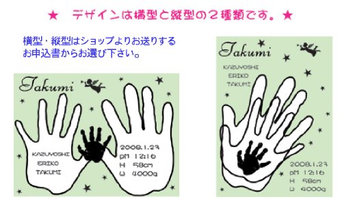 - ◆彫刻 赤ちゃんのお名前と手形・パパとママのお名前と手形 生年月日・出生時間・身長・体重・エンジェル・流れ星が入ります。 ●デザインは縦型と横型です。
