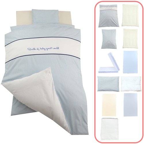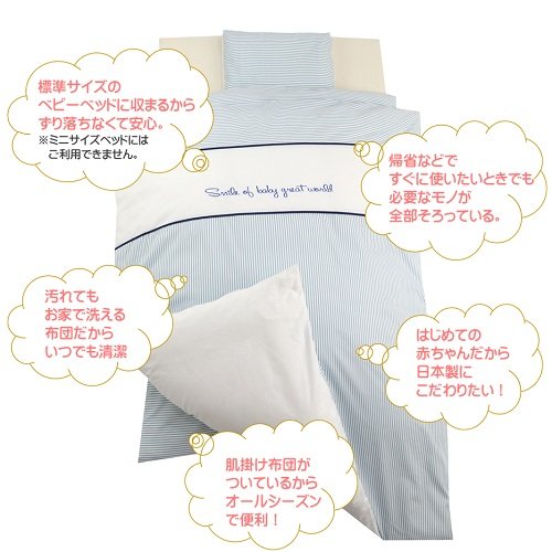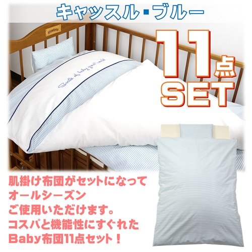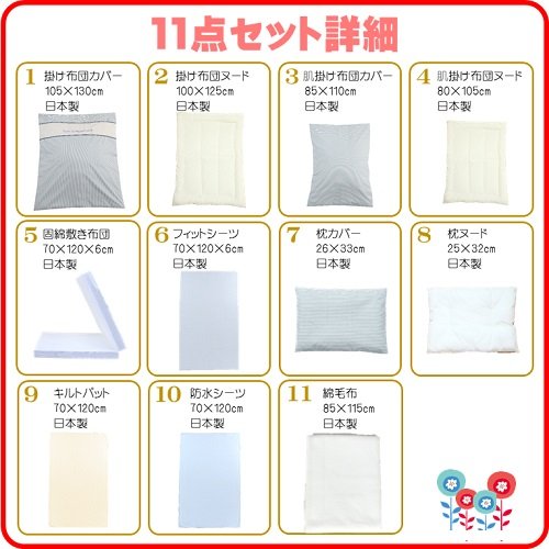 まるでミンクのような肌ざわりのやさしい綿毛布を加え、必要なものが全部揃っているから初めてのママでも安心。ご家庭で洗える安心・安全な 「 日本製 」 レギュラーサイズのベビー布団11点セットです。●●洗える中綿テイジンのウォシュロンECOを使用●●☆洗濯しても軽くてふっくらした優れたクッション性。☆やさしい感触と高度な耐久性。☆羽毛のように軽くて暖かい中綿。☆優れた復元力をつくり出す、複合3次元捲縮。☆安心・清潔・ウォッシャブルでアレルギーを起こしにくい。●●ランダムウェーブ方式●●☆健康睡眠のための次世代構造で厚さ6cmの敷き布団を採用。☆ほど良い弾力が赤ちゃんの体をしっかりと支えます。☆敷き布団カバーは、白無地のワンタッチ式です。 商品素材 ◆ 掛け布団カバー:105cm×130cm:綿100% ◆ 掛け布団ヌード:100cm×125cm:側生地 ポリエステル65%・綿35%、中綿 ポリエステル100% ◆ 肌掛け布団カバー:85cm×110cm:綿100% ◆ 肌掛け布団ヌード:80cm×105cm:側生地:ポリエステル65%・綿35%:中綿:ポリエステル100% ◆ フィットシーツ(敷き布団カバー):70cm×120cm×6cm:綿100% ◆ 固綿敷き布団:70cm×120cm×6cm:側地 ポリエステル65%・綿35%、中綿:ポリエステル100% ◆ 枕カバー:26cm×33cm:綿100% ◆ 枕ヌード:25cm×32cm:側地 ポリエステル65%・綿35%、中綿 ポリエステル100% ◆ 汗取りキルトパット:70cm×120cm:表地 綿100%、裏地 ポリエステル65%・綿35%、詰め物 ポリエステル100% ◆ 防水シーツ:70cm×120cm:ポリエステル100% ◆ 綿毛布:85cm×115cm:綿100% ※すべて日本製です。