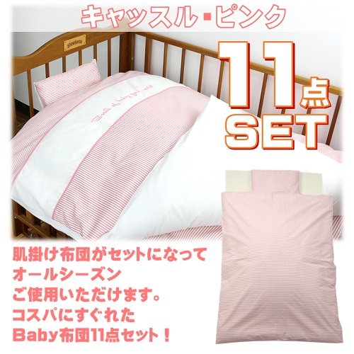 「 日本製 」 ベビー布団 セット レギュラーサイズ 11点 セット 高級綿毛布がセットになったかわいいデザイン 『 キャッスル・ブルー / ピンク / ベージュ 』 (キャッスル・ピンク)