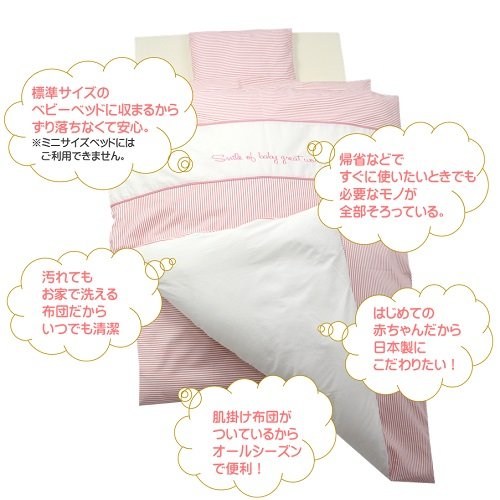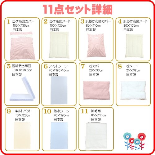 まるでミンクのような肌ざわりのやさしい綿毛布を加え、必要なものが全部揃っているから初めてのママでも安心。ご家庭で洗える安心・安全な 「 日本製 」 レギュラーサイズのベビー布団11点セットです。●●洗える中綿テイジンのウォシュロンECOを使用●●☆洗濯しても軽くてふっくらした優れたクッション性。☆やさしい感触と高度な耐久性。☆羽毛のように軽くて暖かい中綿。☆優れた復元力をつくり出す、複合3次元捲縮。☆安心・清潔・ウォッシャブルでアレルギーを起こしにくい。●●ランダムウェーブ方式●●☆健康睡眠のための次世代構造で厚さ6cmの敷き布団を採用。☆ほど良い弾力が赤ちゃんの体をしっかりと支えます。☆敷き布団カバーは、白無地のワンタッチ式です。 商品素材 ◆ 掛け布団カバー:105cm×130cm:綿100% ◆ 掛け布団ヌード:100cm×125cm:側生地 ポリエステル65%・綿35%、中綿 ポリエステル100% ◆ 肌掛け布団カバー:85cm×110cm:綿100% ◆ 肌掛け布団ヌード:80cm×105cm:側生地:ポリエステル65%・綿35%:中綿:ポリエステル100% ◆ フィットシーツ(敷き布団カバー):70cm×120cm×6cm:綿100% ◆ 固綿敷き布団:70cm×120cm×6cm:側地 ポリエステル65%・綿35%、中綿:ポリエステル100% ◆ 枕カバー:26cm×33cm:綿100% ◆ 枕ヌード:25cm×32cm:側地 ポリエステル65%・綿35%、中綿 ポリエステル100% ◆ 汗取りキルトパット:70cm×120cm:表地 綿100%、裏地 ポリエステル65%・綿35%、詰め物 ポリエステル100% ◆ 防水シーツ:70cm×120cm:ポリエステル100% ◆ 綿毛布:85cm×115cm:綿100% ※すべて日本製です。