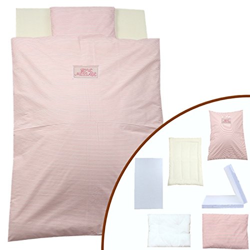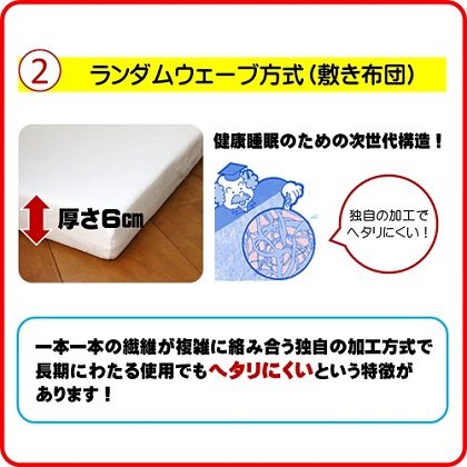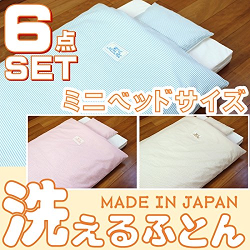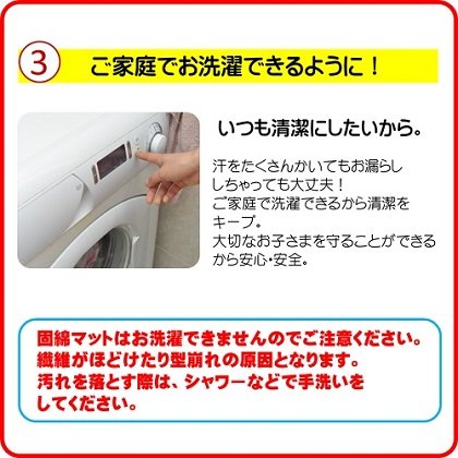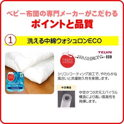 ≪掛け布団には洗える中綿テイジンのウォシュロンECOを使用≫ ☆洗濯しても軽くてふっくらした優れたクッション性。 ☆やさしい感触と高度な耐久性。 ☆羽毛のように軽くて暖かい中綿。 ☆優れた復元力と複合3次元捲縮。 ☆安心・清潔・ウォッシャブルでアレルギーを起こしにくい。 ≪敷き布団にはランダムウェーブ方式を採用≫ ☆健康睡眠のための次世代構造で厚さ6cmの敷き布団を使用。 ☆ほど良い弾力が赤ちゃんの体をしっかりと支えます。 ☆敷き布団カバーは、白無地のワンタッチ式です。