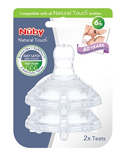 Age guide 6 months +;2 pack. BPA FREE;SoftFlexTM fast flow teats;Breast size teat encourages latch on. Suitable for all Natural TouchTM bottles;Flexes, stretches & moves just like mum's nipple. Advanced anti colic teat for bottle feeding