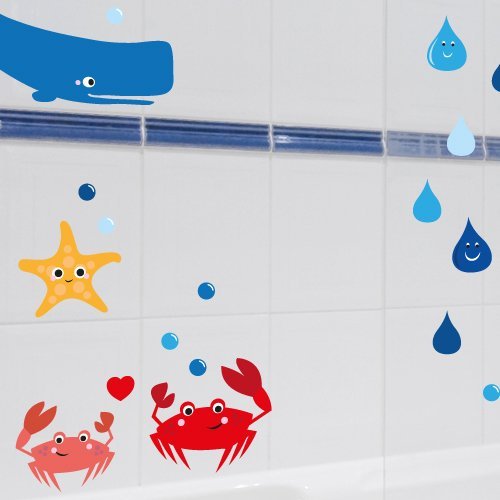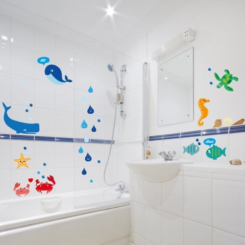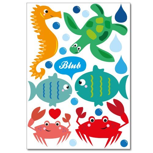 Pack includes: Instructions, wall stickers. Yay! Sea creatures are now available as a colourful wall sticker set. On 2 A4 sheets, you will get more than 40 individual wall stickers. Stick the little sea creatures to the walls of your bathroom, your nursery or anywhere else you'd like to see them every day. The wall stickers stick to tiles, walls, mirrors, furniture and many other surfaces. The set has small crabs, seahorses, shells, fish, whales, a turtle and a starfish. In addition, you get lots of bubbles and water drops, even water drops with funny faces saying "Hi!" and "Blub". If you change your mind, no problem - these wall stickers are reusable!