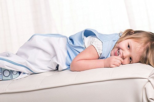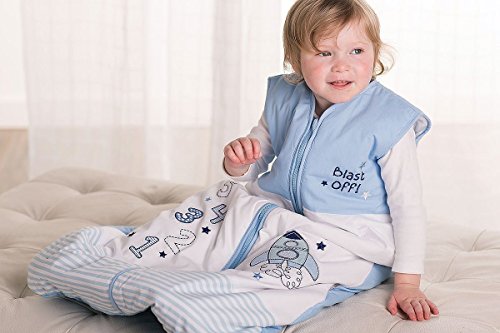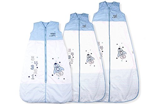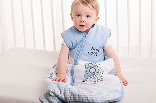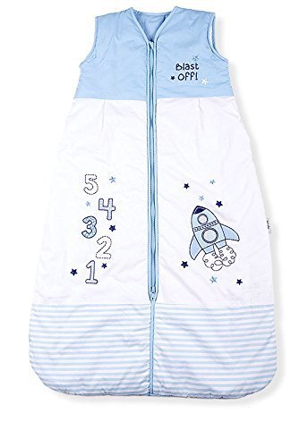 Fun loving appliqu? and embroidery space design sleeping bag on blue and white with blue trim and snaps under the arms, in order to ensure a comfortable fit for all sizes with a central double zipper and fabric cover.;Centre zip to allow easy access;Lining and outer fabric made from 100% soft cotton, This sleeping bag is machine washable at 40? and can be tumble dried;Available in a range of sizes (Size 2: 6-18 months, Size 3: 12-36 months, Size 4: 3-6 years);Range of warmth ratings available (Lightweight is approx 0.5 Tog, Summer weight is approx 1.0 Tog, Standard weight is approx 2.5 Tog, Winter weight is approx 3.5 Tog)