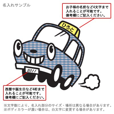 タータンチェックのかわいいくるまくん。名前と誕生年が入れられます。※スタイには誕生年は入れられません。