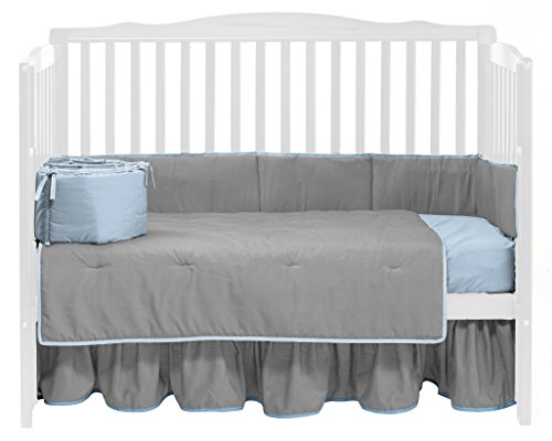 Baby doll bedding's 4 piece solid reversible crib bedding set will add a classy look to any nursery.Made from combination of the softest grey and blue poly cotton fabrics.Coordinating accessories and bedding available.Machine washable.Fully manufactured in the USA.