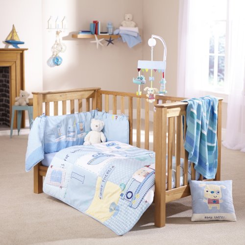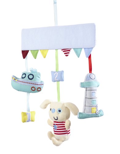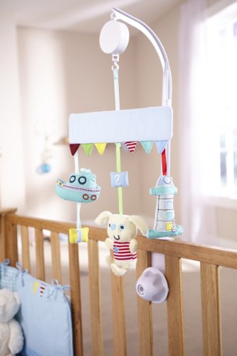 The Ahoy Musical Mobile is part of a perfect range for your little boy. This soothing rotating mobile is calming and sweet, to help relax your little one off to sleep. We offer a complete range including moses baskets, mobiles and cushions and this will match it beautifully! Suitable from birth unless unsupervised. Age recommendations are guideline only. Full Ahoy range available including Moses Baskes, Wicker Moses Baskets, Activity Cushion, Crib Set and Cot Bed Set! Perfect to complete your nursery