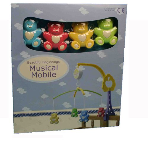 The Beautiful Beginnings bear mobile gently rotates to the sounds of ?Brahms Lullaby?. It is suitable from birth and upwards and has an adjustable clamp that will fasten onto the cot. An ideal soothing item that once started will gently lull and soothe your baby to sleep. The brightly coloured, friendly bears help your baby to settle down for their sleep.We can?t promise that the Beautiful Beginnings range of nursery products will make your child a genius, but they will certainly stimulate their senses and help to develop their skills. There?s only one word for this Beautiful Beginnings Nursery Product and that word is ?Quality?.