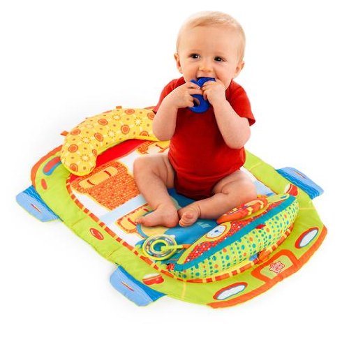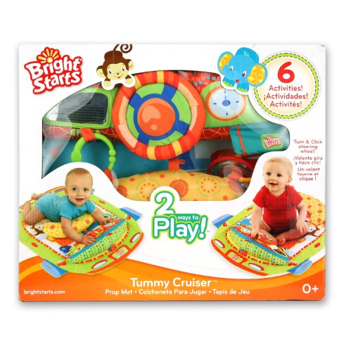 The Bright Starts? Tummy Cruiser? Prop & Play Mat is an adorable play area for baby! The soft, padded car shaped mat encourages tummy-time play and exercise in a bright, fun, auto theme. The activity dashboard features a steering wheel that clicks when turned, baby safe mirror for self-discovery, and removable prop pillow with fun ring rattles and teether keys. The perfect mat for any growing baby! Features: