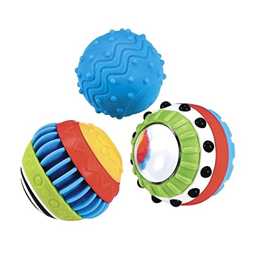 Pack of three balls with lots of different textures to explore. Great for stimulating babies senses and fun for them to explore. Encourages movement.