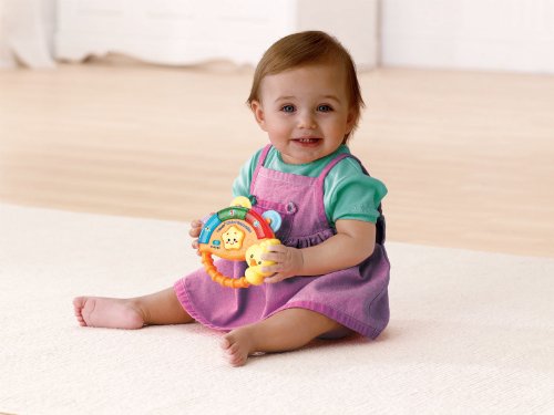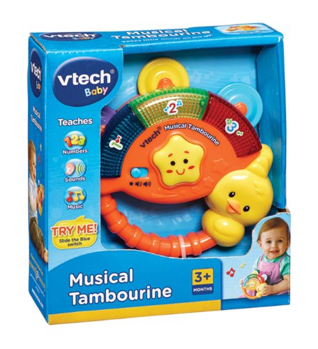 The VTech Musical Twinkle & Learn Tambourine helps your baby learn 1-2-3 and listen to fun tunes by pressing the big star shaped button and shaking the tambourine. There are three colourful lights that will flash along to the sounds and melodies, and tambourine pieces that make shaking even more fun. There is also a cute bird on the large and easy-to-grasp handle that makes this tambourine appealing to your baby. The VTech Musical Tambourine rewards baby as they learn that their actions have reactions, encourages fine motor skill development, and enhances musical skills with music and sound activities.
