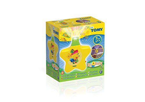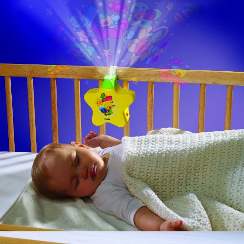 Even the youngest of babies have active minds as they lie in their cot. The Starlight Dreamshow from Tomy is designed to occupy those little minds, then relax them and lull them to sleep.Consisting of a small moulded plastic moulded star, measuring roughly 14 cm (5.5 inches) from tip to tip and 6 cm (2.5 inches) in depth, the Starlight Dreamshow has several operational modes controllable using a switch. Move the switch from 'off' to either the '5 min' or '10 min' setting, then choose between pictures only or pictures and music. On the latter setting, the Starlight Dreamshow will project small, pastel images of teddies, stars, moons, and clouds onto the ceiling, while playing through three soft, gentle lullabies. On the first setting, the pictures are shown in silence. If your baby isn't asleep by the time the Starlight Dreamshow automatically switches off, just press the on button again for a replay. The Starlight Dreamshow can also be switched off early, during either of the timed programmes.Suitable from birth, the Starlight Dreamshow requires 4 AA batteries, which are not included. A handy plastic strap comes with the unit, which can be fitted to the unit to fix it to the side of a cot, or removed so the projector can be free standing on a chest of drawers or bedside cabinet. The image of a teddy bear on a cloud pictured on the front of the Starlight Dreamshow finishes off the beautiful effect and makes this a lovely addition to any nursery.