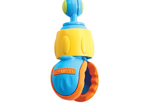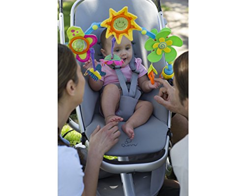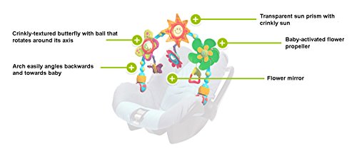 The Sunny Stroll arch features two key development features - batting (0-3 months) and manipulating (3+ months). The colorful, flexible arch features a rattling butterfly ball with crinkly texture, transparent sun prism, baby-activated propeller, flower mirror and crinkly butterfly. Includes easy-attachment clips: simply turn the yellow nut to securely attach the toy to a stroller or baby carrier, sold separately. Measures 20" x 12" x 3".