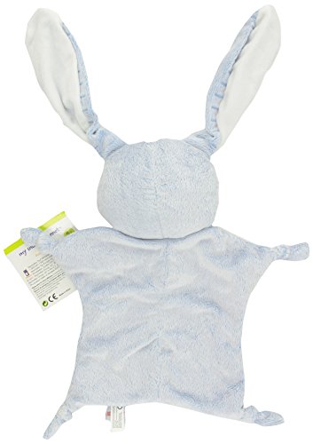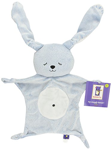 Snuggle up with My Snuggly Bennett from Manhattan Toy. This adorable baby blue bunny features an adorable soft plush head with long, floppy bunny ears and sleepy eyes. The head is attached to a luxuriously silky textured soft mini blanket with a fluffy little bunny pom-pom tail. The blue My Snuggly Bunny is just the thing your little one will love to hold onto for comforting, warm snuggles and is a wonderful gift for the arrival of a new baby boy. The knotted corners of the soft blankie also make nice comforting features that small hands can start to grip. Suitable from birth