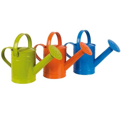 Twigz watering cans come in three different colours (blue, orange and green), all 1.5 Litre in volume and have two handles. One handle over the top of the body for carrying around the garden and the handle on the back of the body to tilt the water over the plants