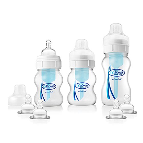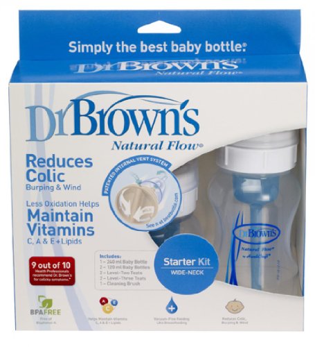 An ideal kit to start bottle feeding. The Dr. Brown's Natural Flow baby bottle was invented by a doctor and tested on his own children when they were babies, so you can be rest assured that this product is as safe as it is effective. This revolutionary baby bottle provides more comfortable feeding and helps colicky babies. This is what makes 9 out of 10 Healthcare Professionals recommend Dr Brown?s Natural Flow for Colic Relief*. Dr Brown's Natural Flow baby bottles are also widely used as a preventative measure against colic - why wait for your baby to experience colic? The Dr Brown?s Natural Flow baby bottles features a patented system with an internal vent designed to create a ?vacuum free? environment. This patented internal vent system eliminates the vacuum and air bubbles found in most baby bottles. It allows air to enter through the teat collar, without being incorporated into the breast milk or formula. The air is then channelled through the internal vent system, to the area behind the feed. Babies are able to feed more comfortably because the vent allows babies to feed without fighting the negative effects of a vacuum or the discomfort of ingesting air bubbles. This reduces colic, burping and wind. 78% of Healthcare Professionals agree that the most common cause of colic in young babies is caused by digestive or feeding problems, including swallowing air*. The breast milk or formula flows freely through the teat as the air is channelled to the top of the bottle. This no-vacuum effect eliminates teat collapse. Over half of those changing to a Dr Brown?s Natural Flow baby bottle saw an improvement in 3 feeds or less, outperforming any other brand* *Results of a HCP Colic Survey carried out by Consumer Analysis Ltd. For full details go to www.colicreport.com